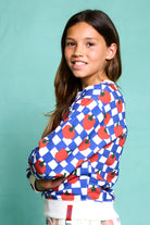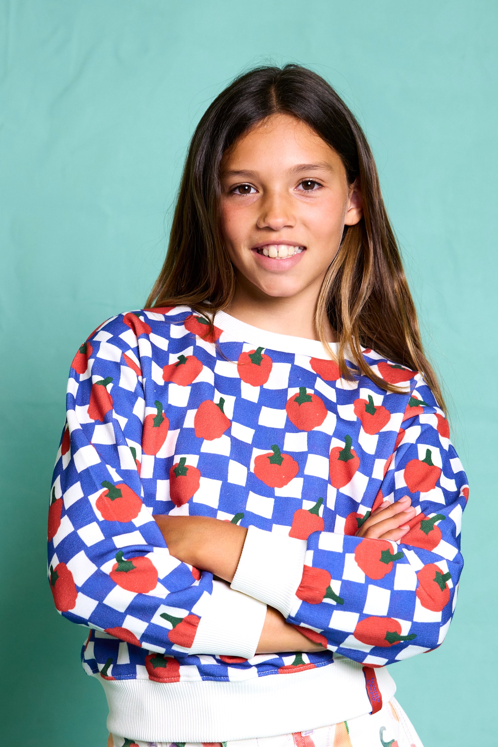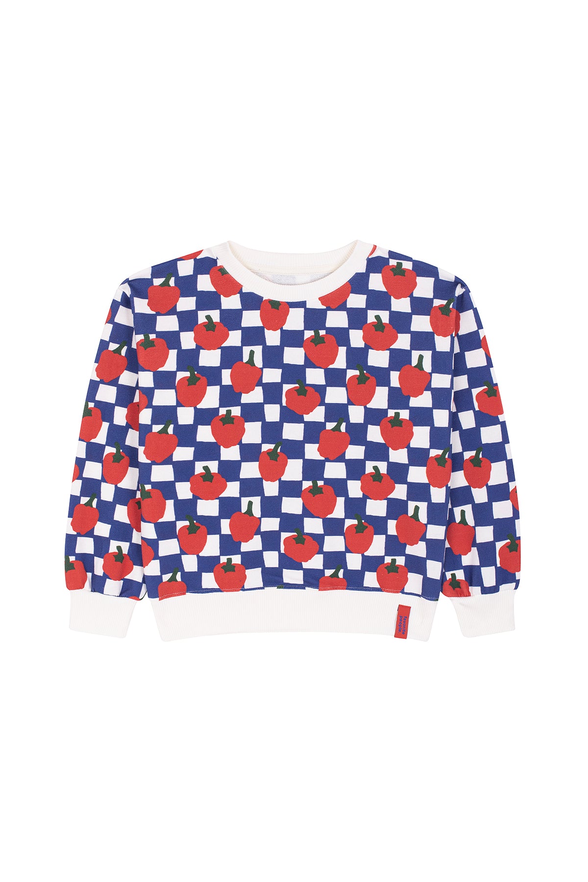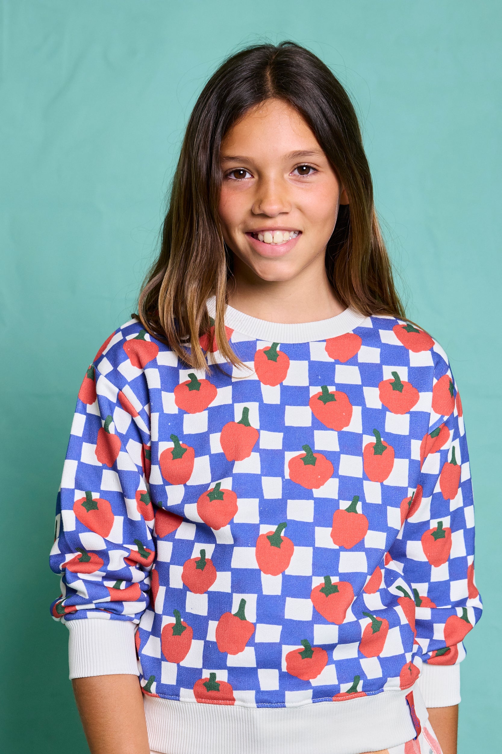 This cozy sweatshirt in blue and white checkered pattern with pepper illustrations adds a pop of fun to chilly days. Made from ultra-soft cotton, it features a relaxed fit, ribbed cuffs, and a playful print that kids will love. Made in Portugal, 100% cotton.