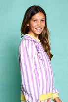 This sweatshirt with ruffles on the shoulders and flared sleeves in white and lilac stripes is made from 100% cotton and has ribbed cuffs. Ideal for cool days with lots of style. Made in Portugal.