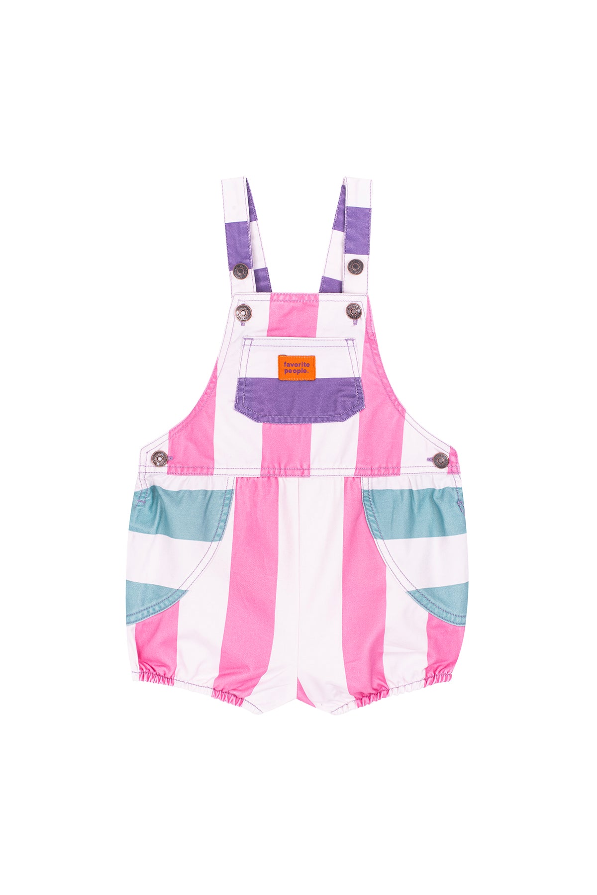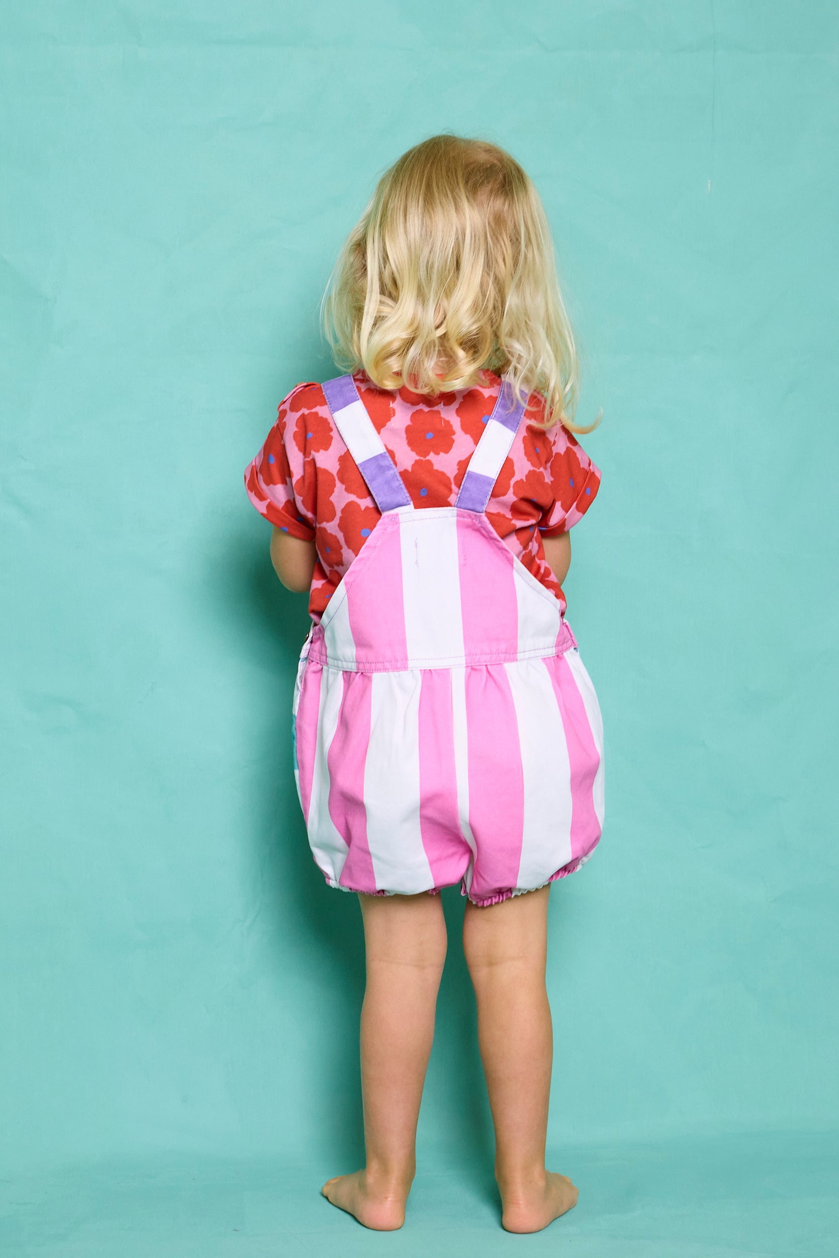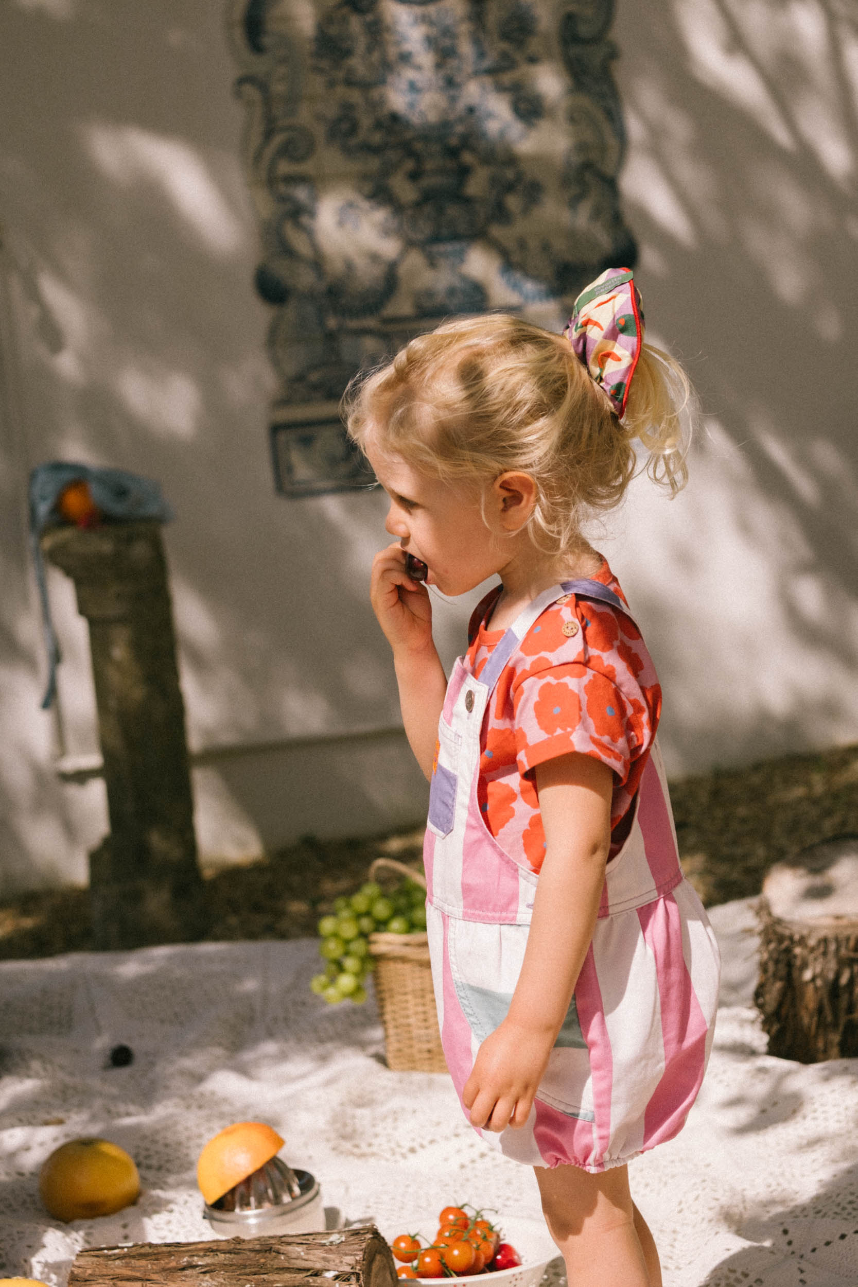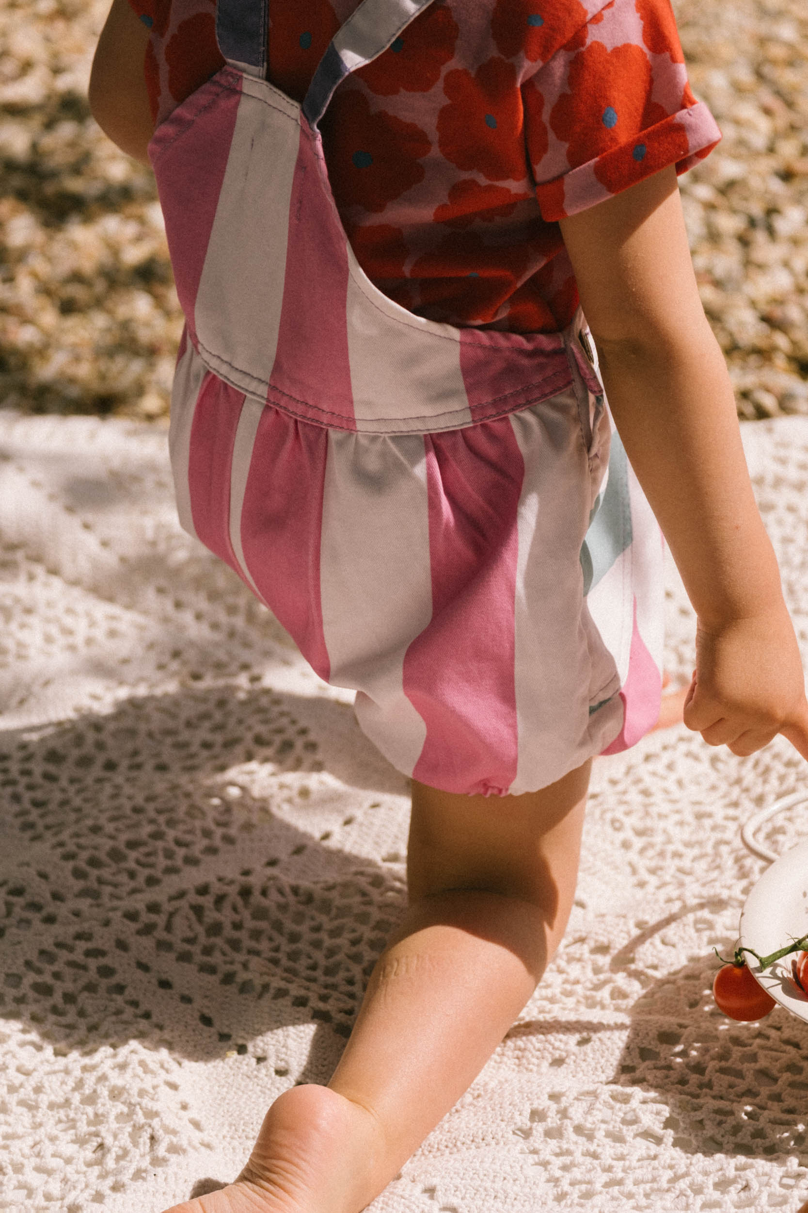 Adorable and comfy, this romper with pink, purple, blue and white stripes is designed for your little one’s everyday adventures. It features adjustable straps with button fastening, a logo front pocket, elasticated leg openings, and snap buttons for easy diaper changes. Made in Portugal from 100% cotton.