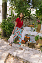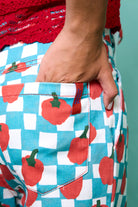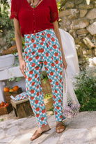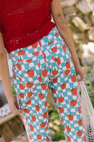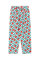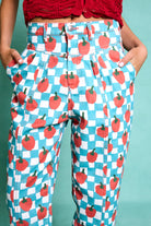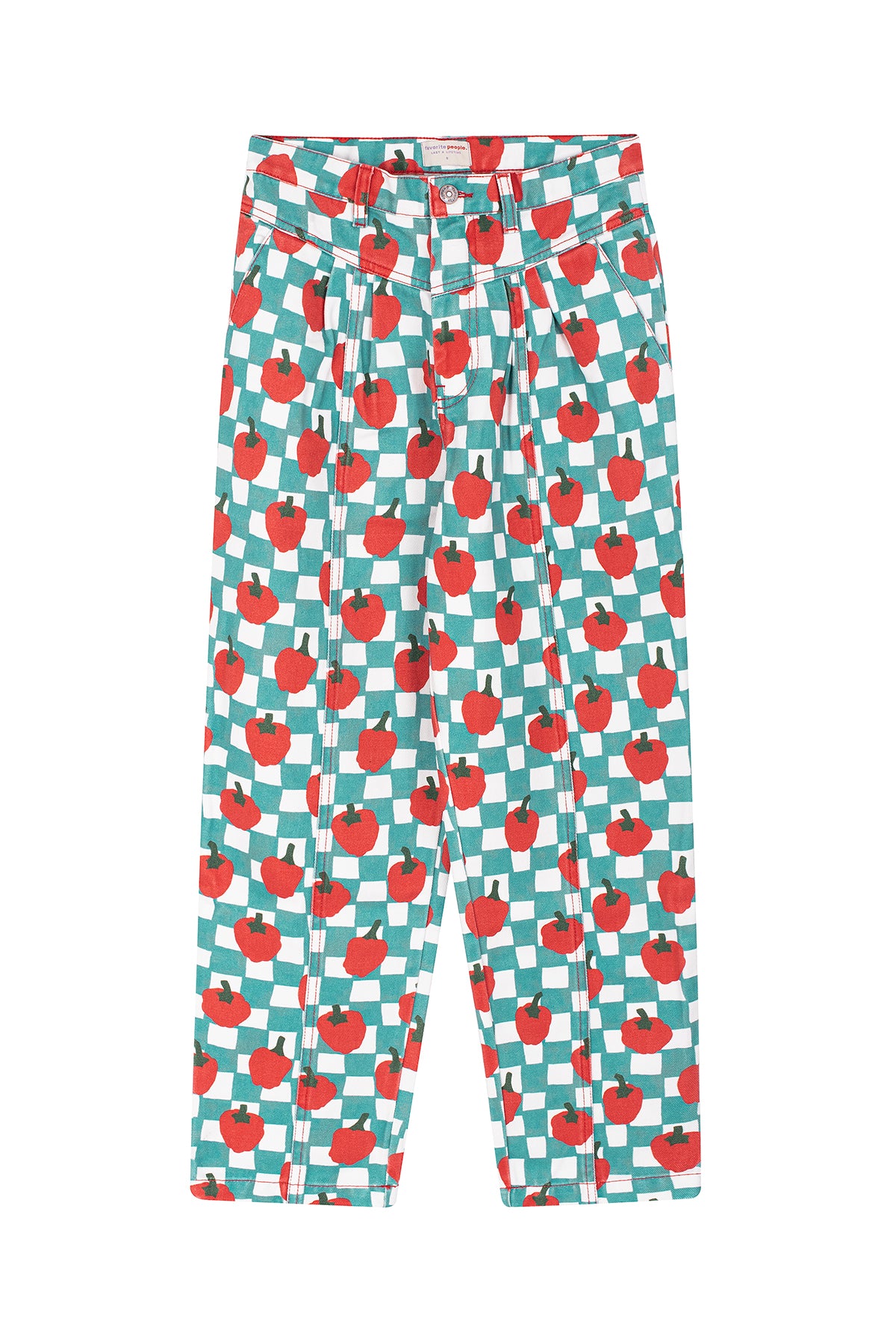 These woman's pants in a blue and white checkered pattern with peppers are all about effortless cool. Featuring a high waist, pleated front, and relaxed fit. Made in Portugal in 100% cotton.