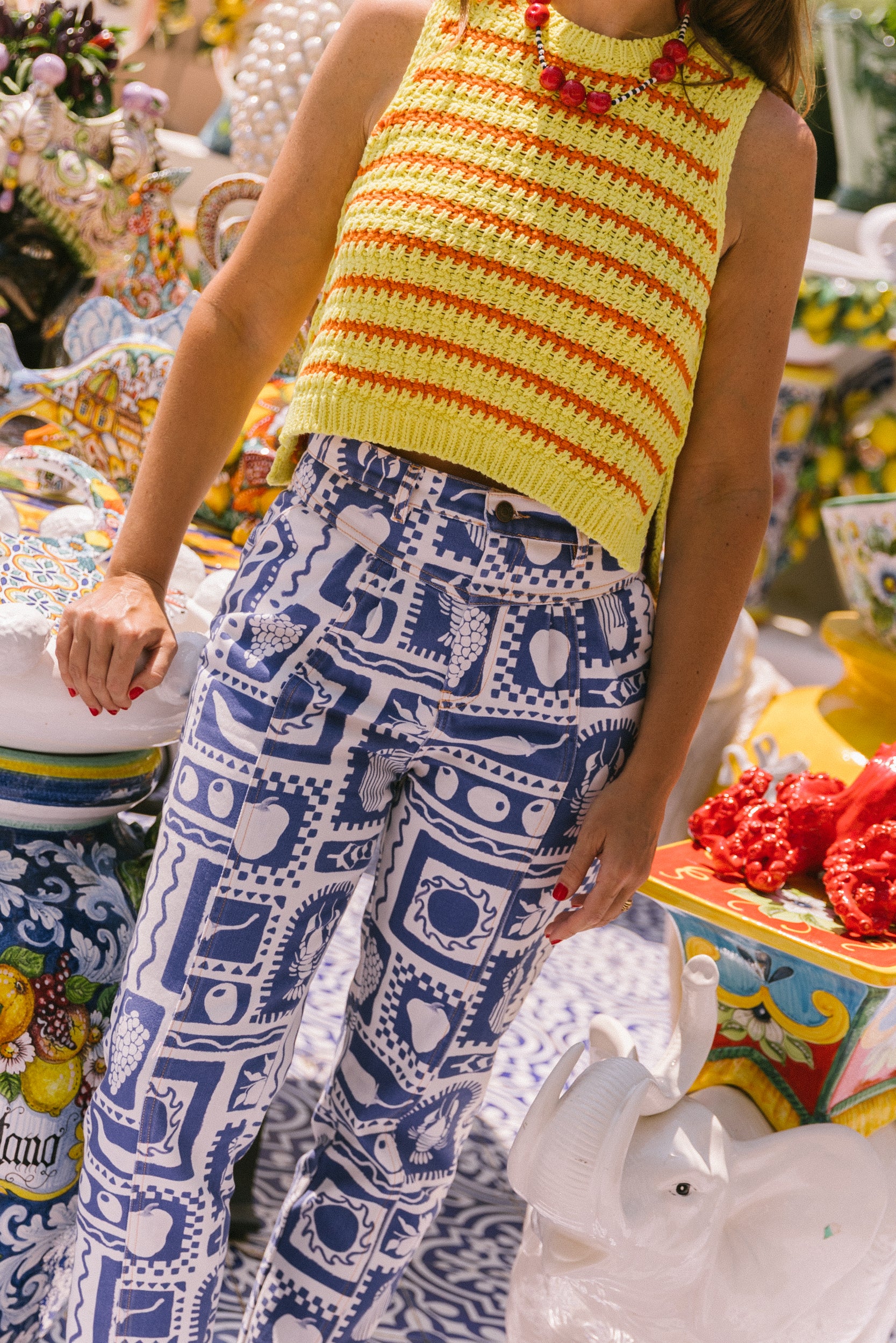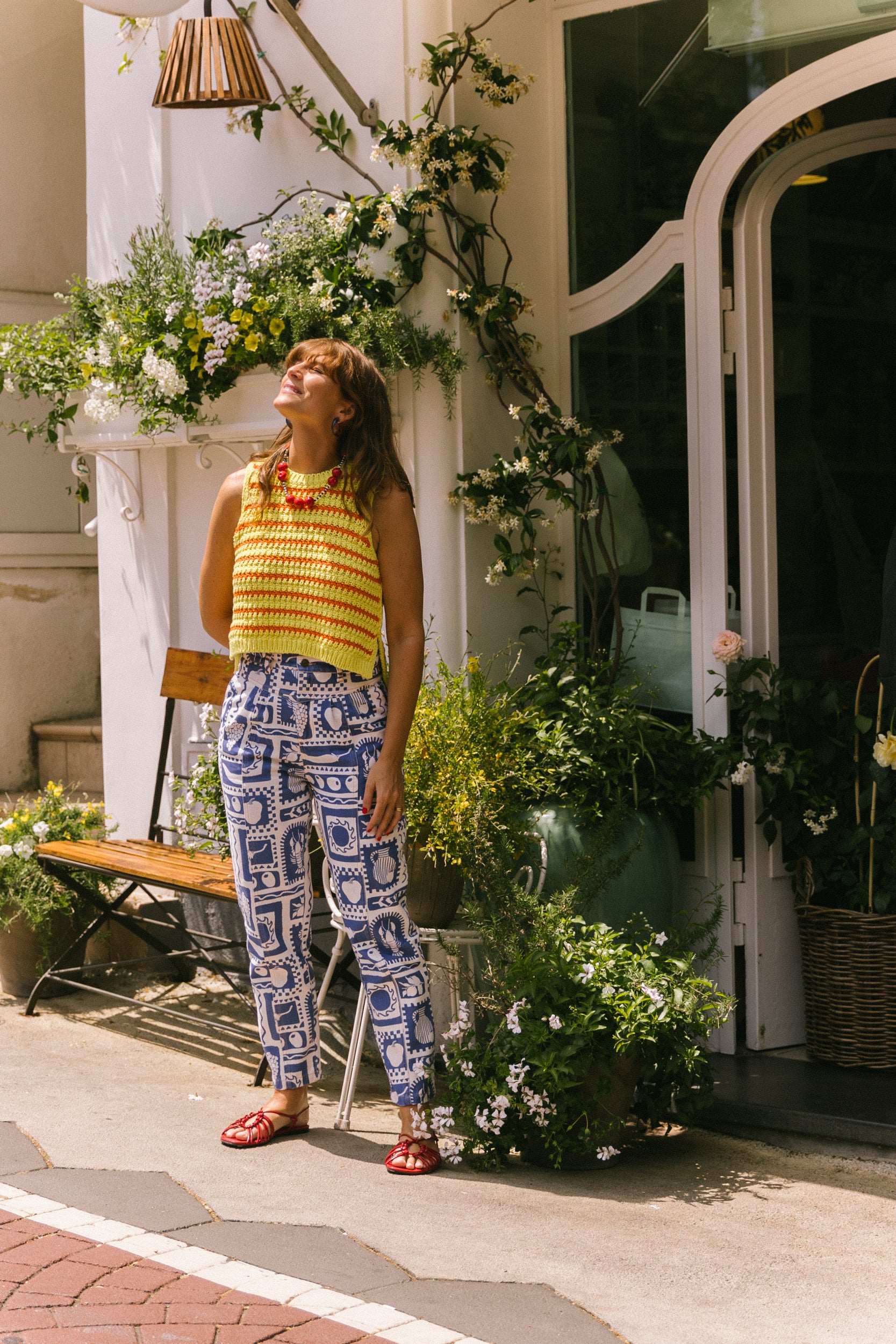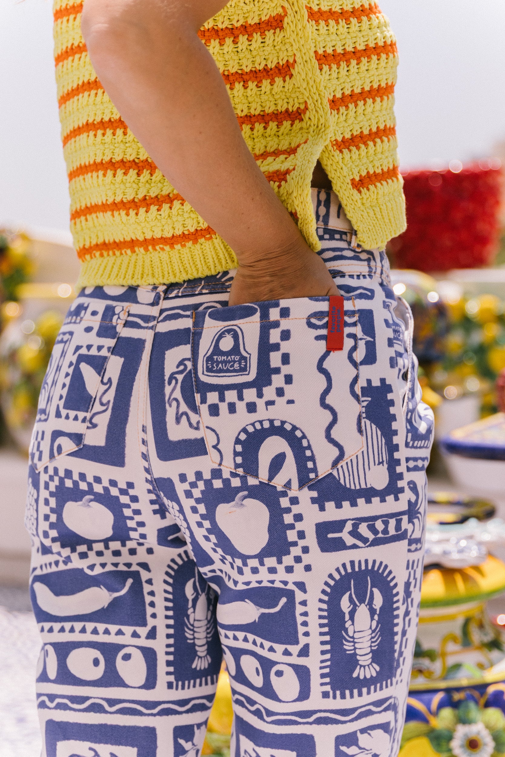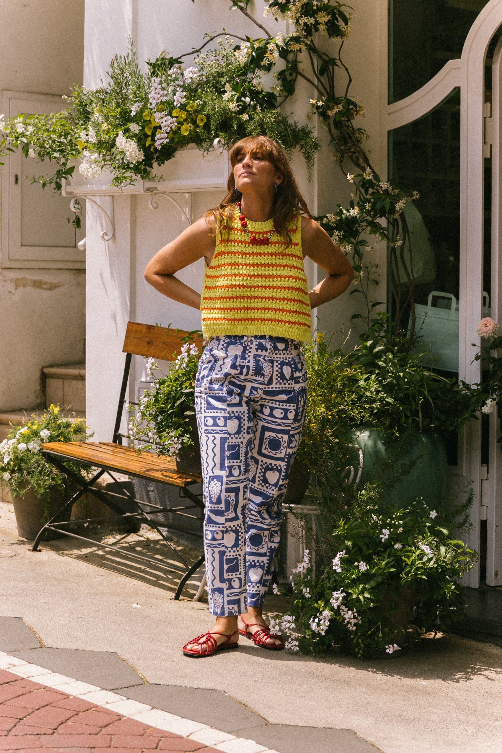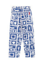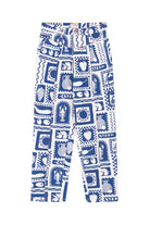These white and blue woman's feature a pattern of illustrations that are all about effortless cool. Featuring a high waist, pleated front, and relaxed fit. Made in Portugal in 100% cotton.
