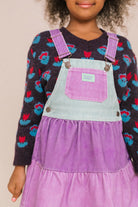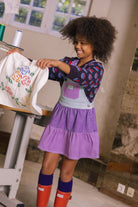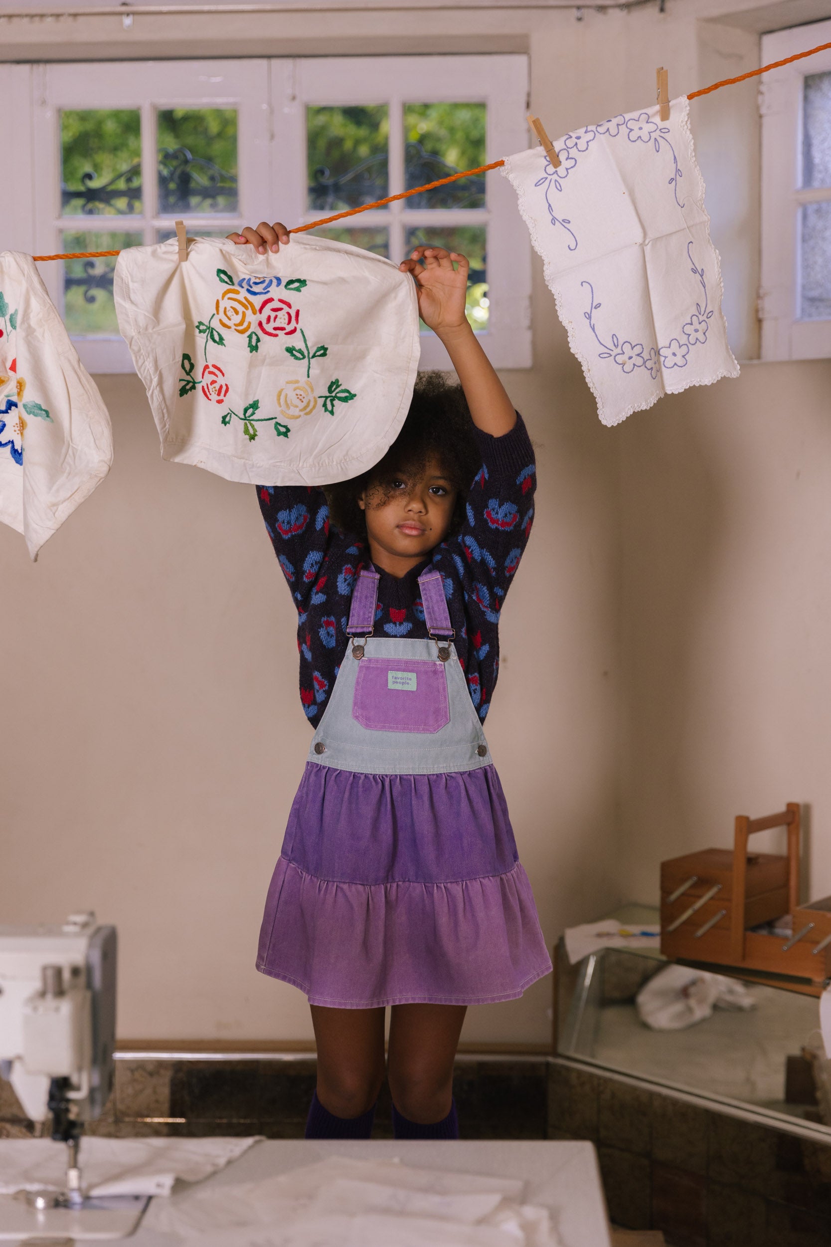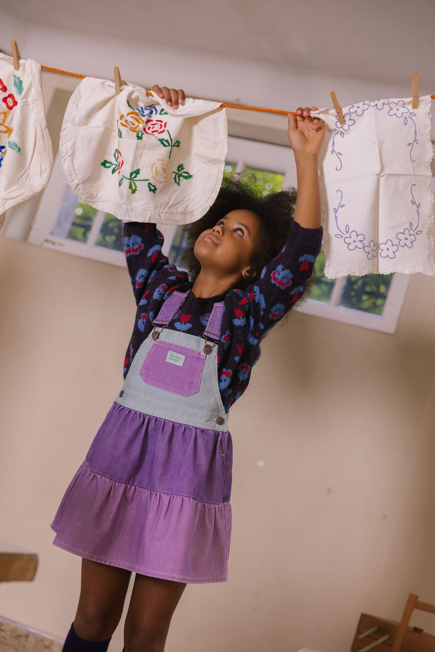 Blue, purple and lilac skirt overalls featuring a straight neckline and adjustable straps with classic dungaree closures. Designed with combined pockets, these overalls also showcase a standout feature: the playful 3-layer skirt, adding extra flair and movement. Crafted in Portugal from 100% cotton, they ensure long-lasting quality and comfort. For best care, wash inside out and avoid mixing with other garments.
