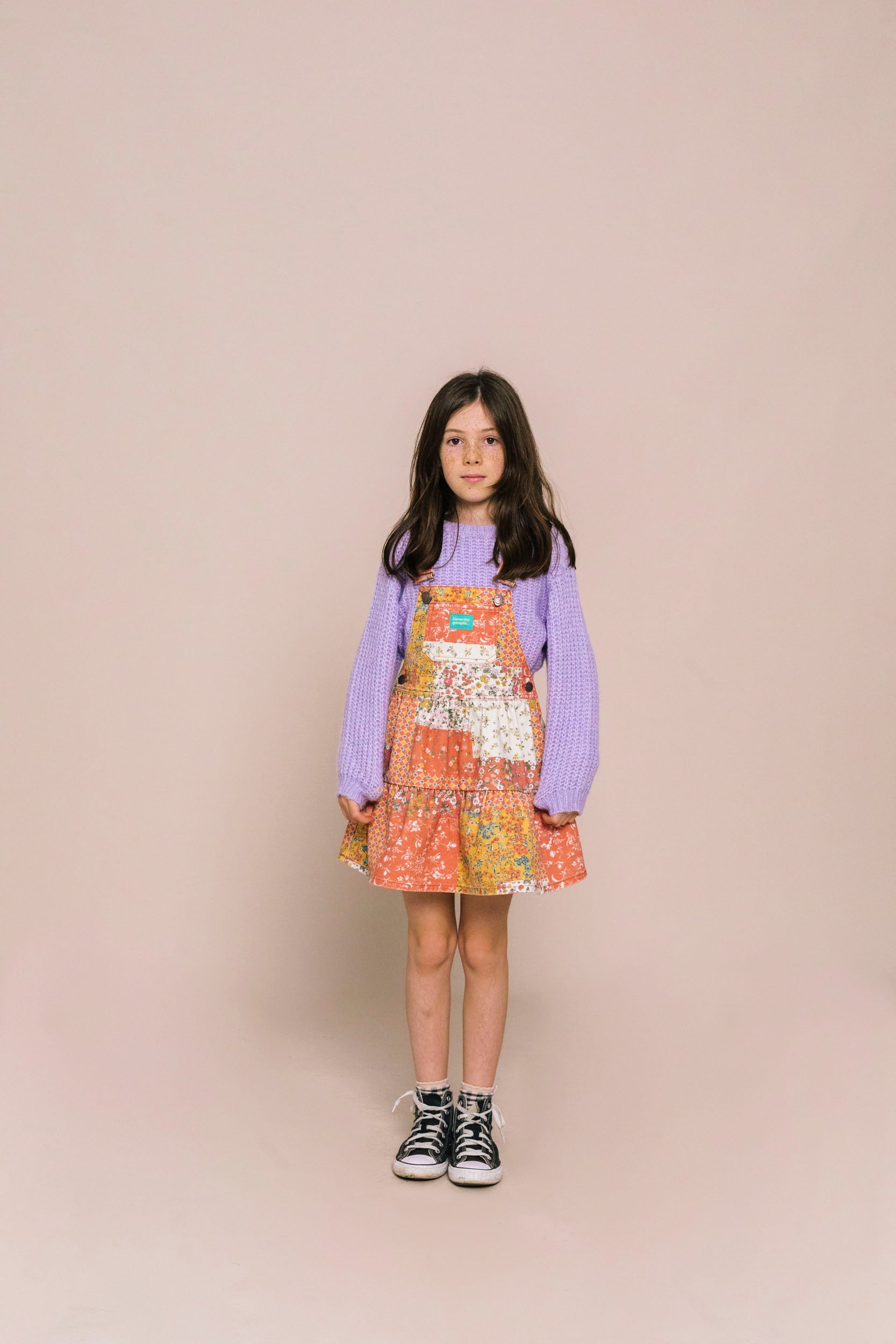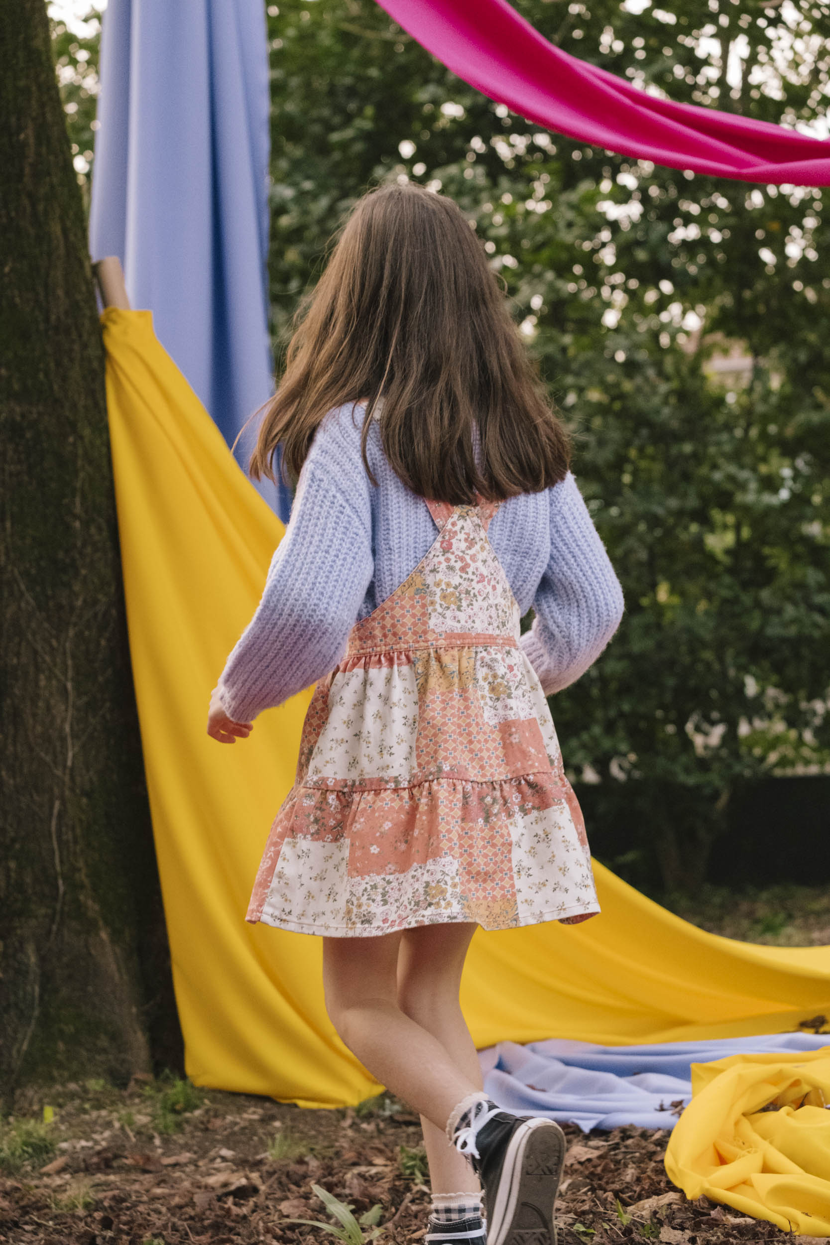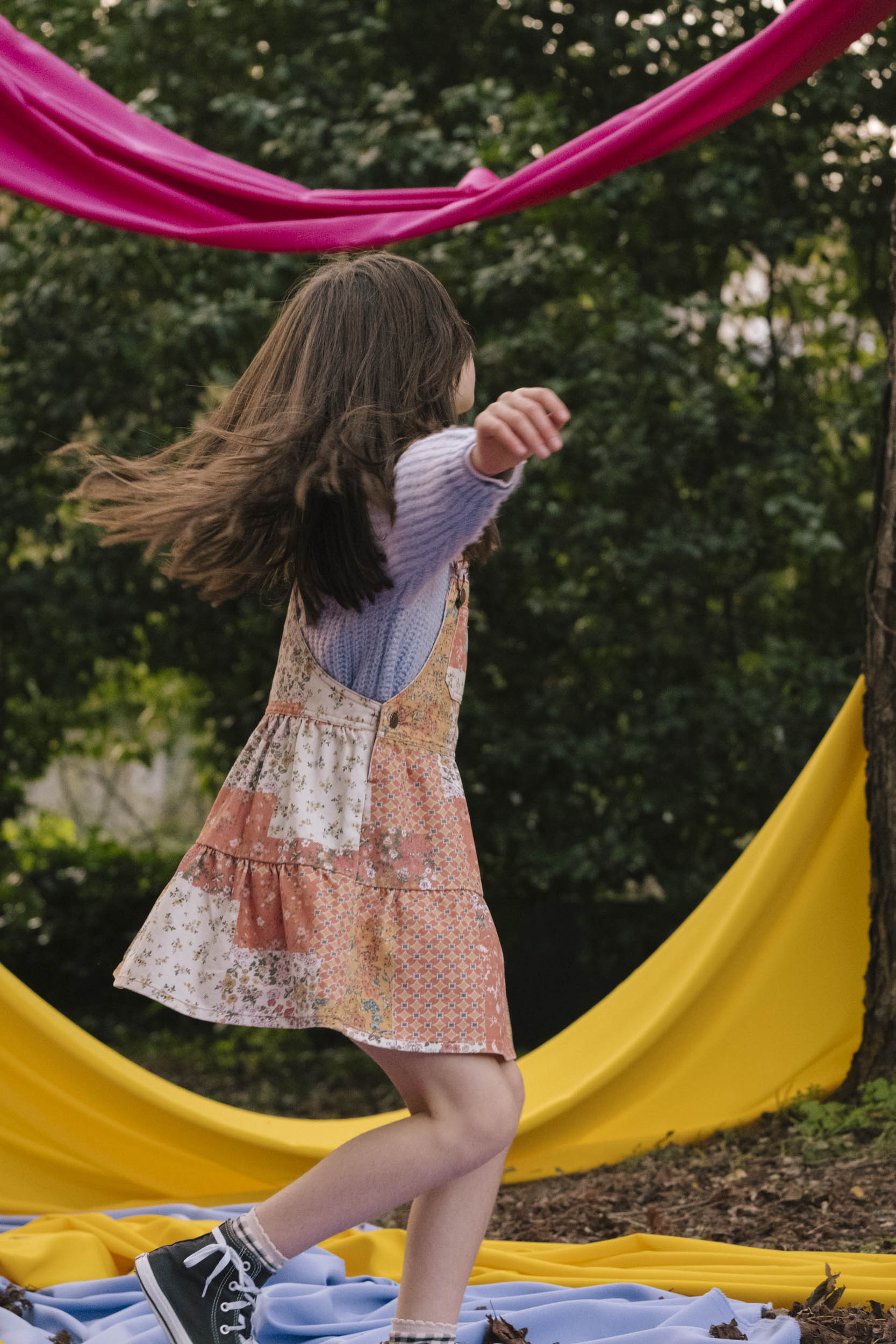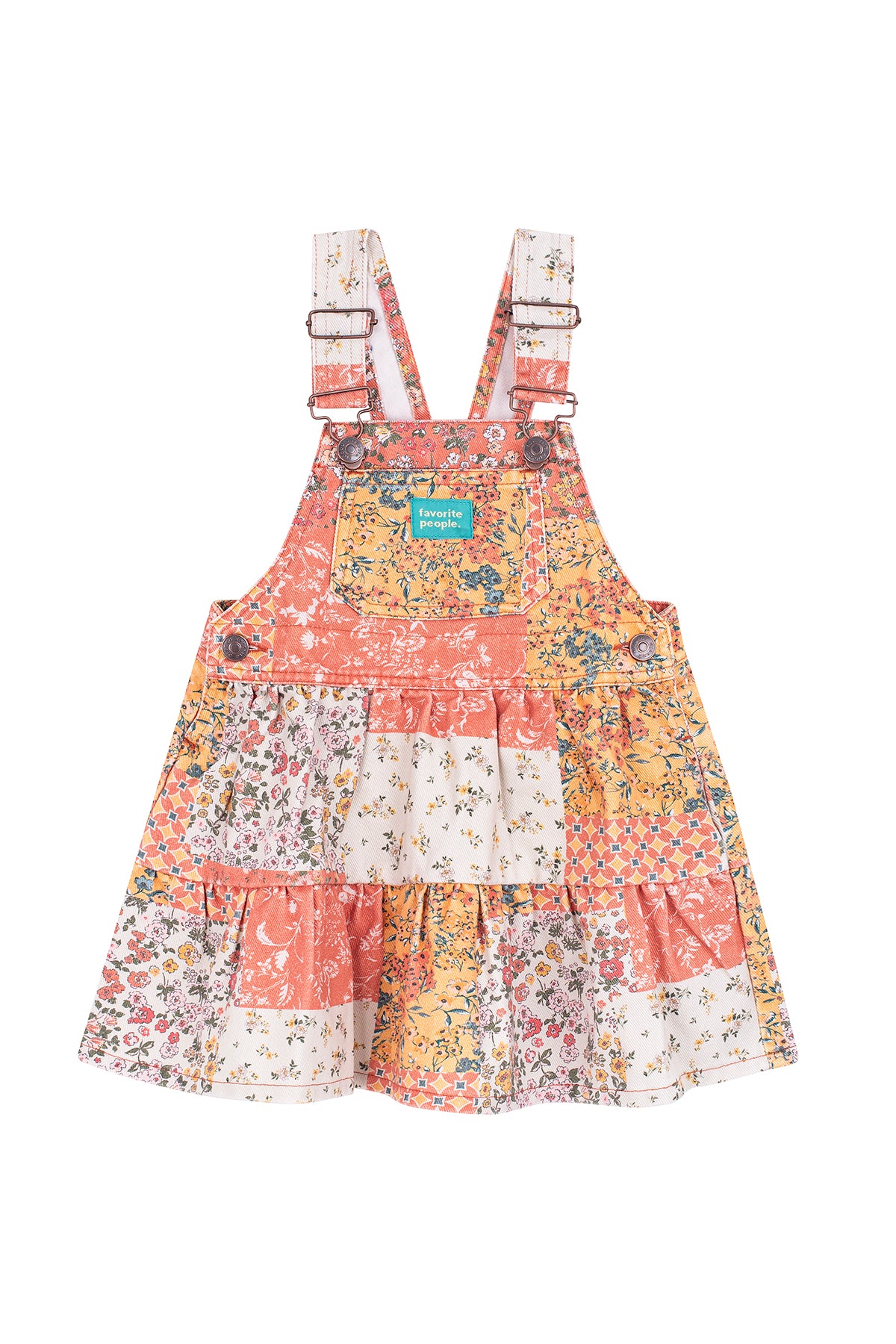 Falda-peto en naranja, blanco y amarillo, con escote recto y tirantes ajustables con cierres clásicos de peto. Diseñada con bolsillos combinados, esta prenda también destaca por su falda de tres capas superpuestas, que aporta movimiento y un toque especial. Confeccionada en Portugal con algodón 100%, garantiza calidad y comodidad duraderas. Para un mejor cuidado, lavar del revés y evitar mezclar con otras prendas.