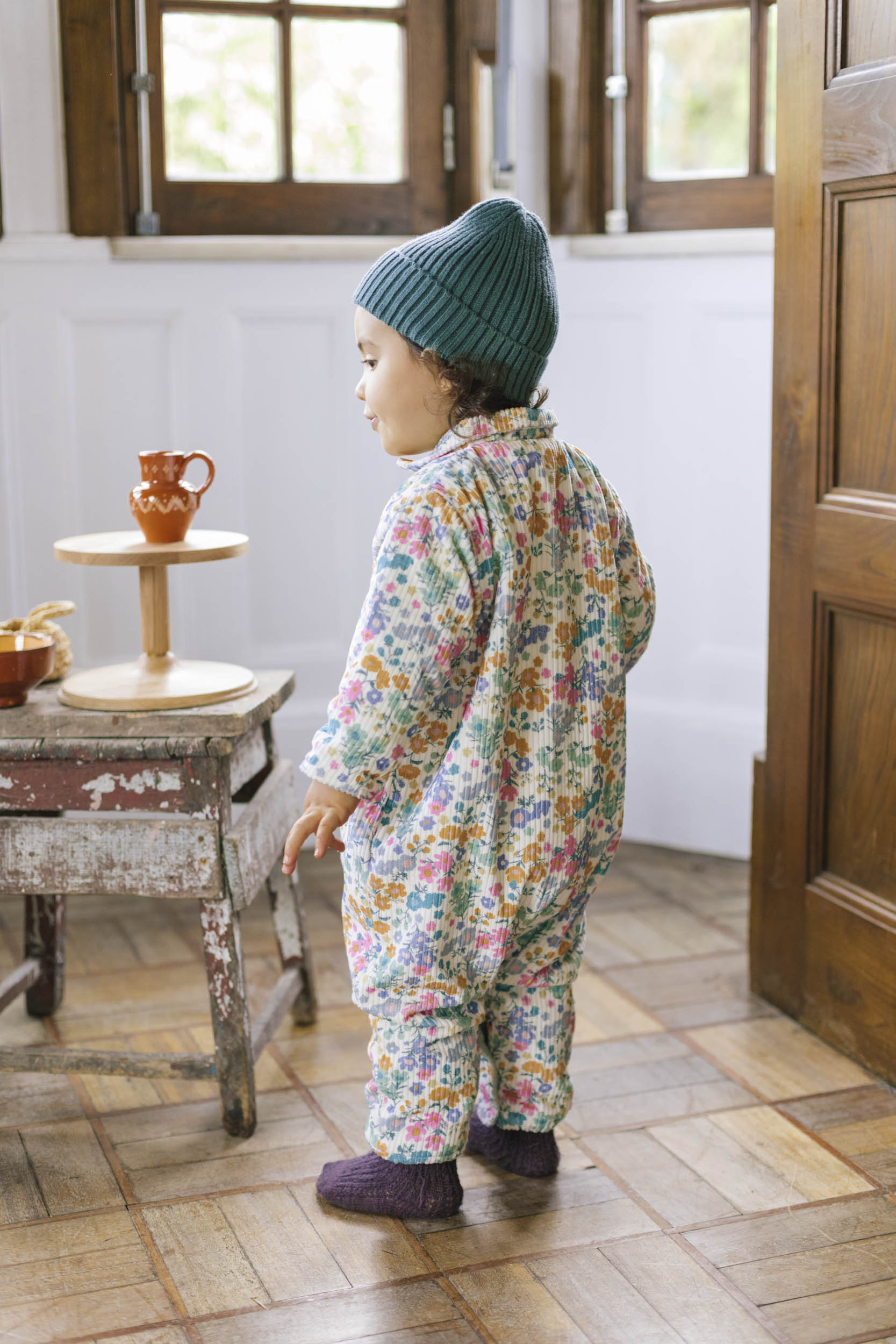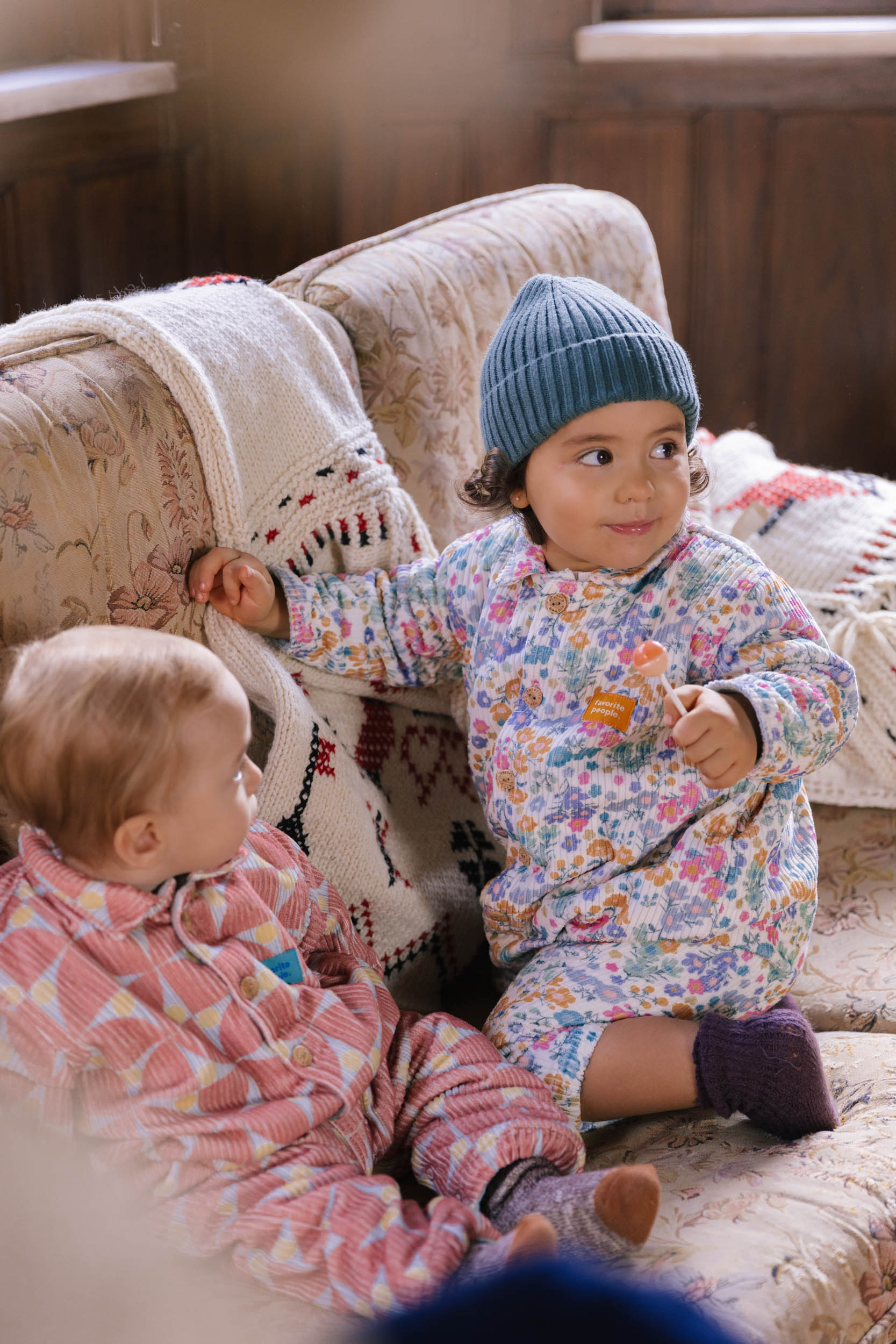 Adorable y funcional, este mono blanco está confeccionado en pana de algodón con un forro interior de polar ultrasuave para mayor calidez y comodidad. Incluye botones a presión para facilitar el cambio de pañal. Orgullosamente fabricado en Portugal. Lavar del revés y por separado para un mejor cuidado. ¡Perfecto para tu bebé favorito!