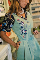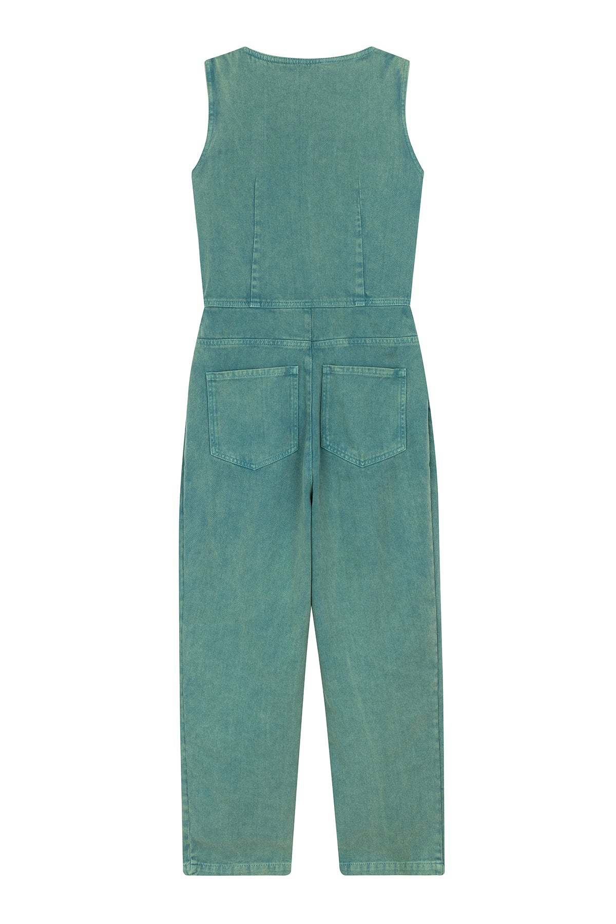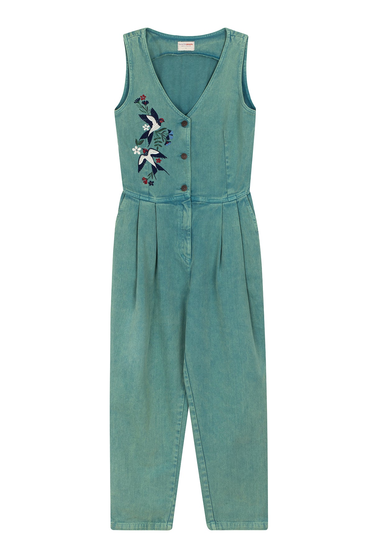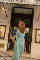 This green jumpsuit is the perfect blend of cool and comfy, ideal for effortless style. Crafted in Portugal from 100% cotton. Featuring a vest-inspired top, a sharp V-neckline, and three buttons down the front, it nails that laid-back, chic vibe. The baggy, relaxed pants add a playful edge, making it your go-to piece for easy, everyday looks. It also features an embroidered swallow detail — a symbol of freedom and Portuguese tradition.