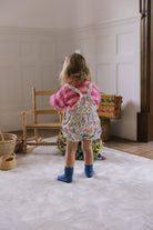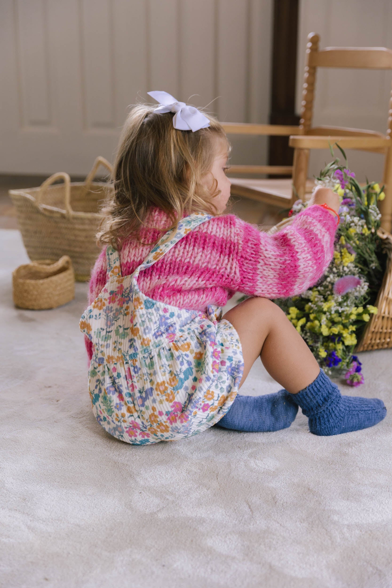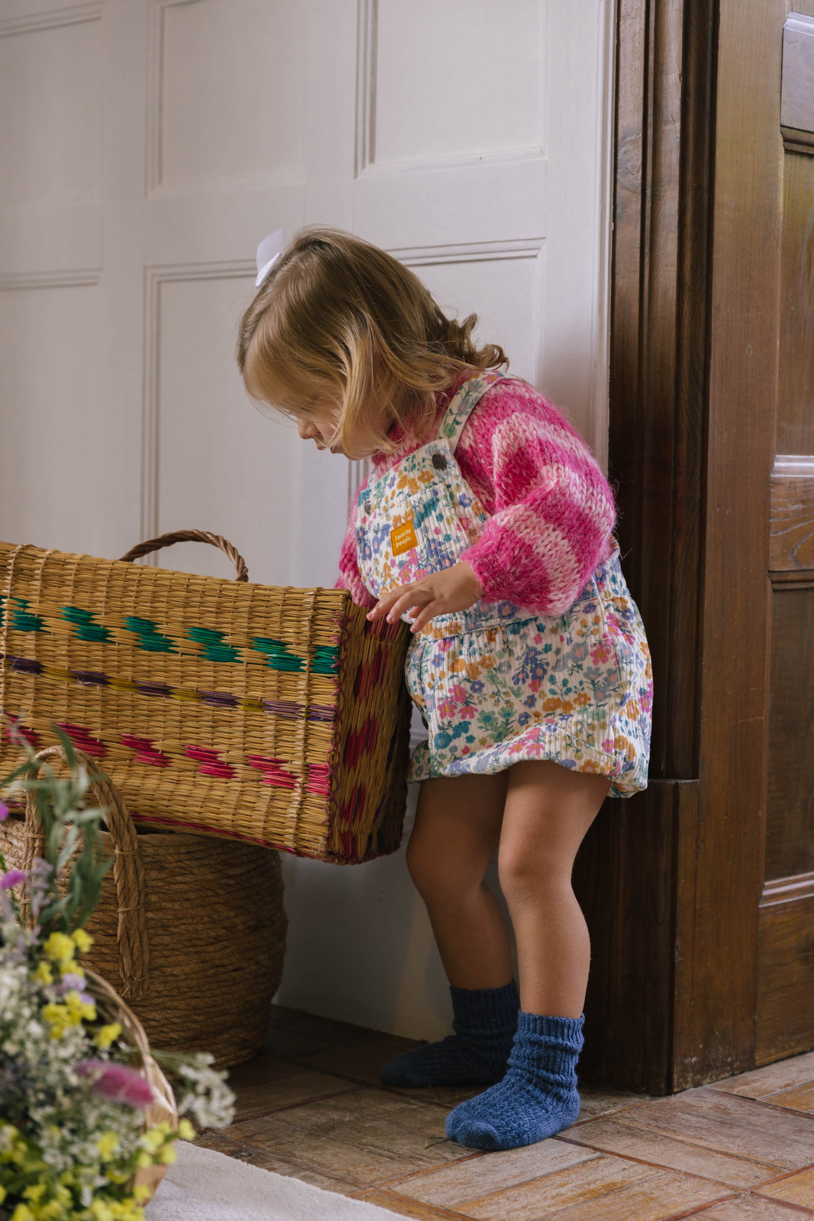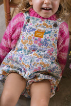 Adorable and functional, this 100% cotton white corduroy romper features adjustable straps with buttons, a front pocket with our logo, elastic thighs for comfort, and snap buttons for easy diaper changes. Proudly made in Portugal. Wash inside out and separately for best care. Perfect for your favorite baby!