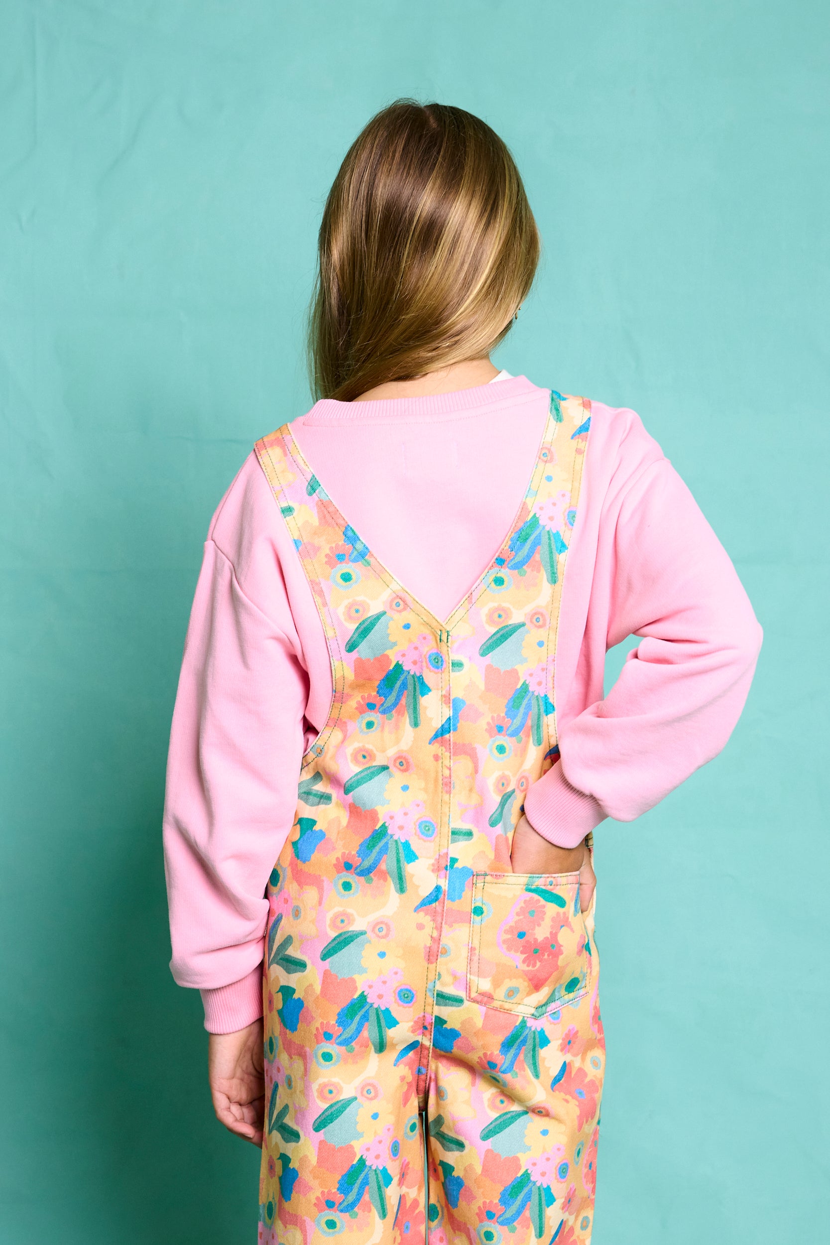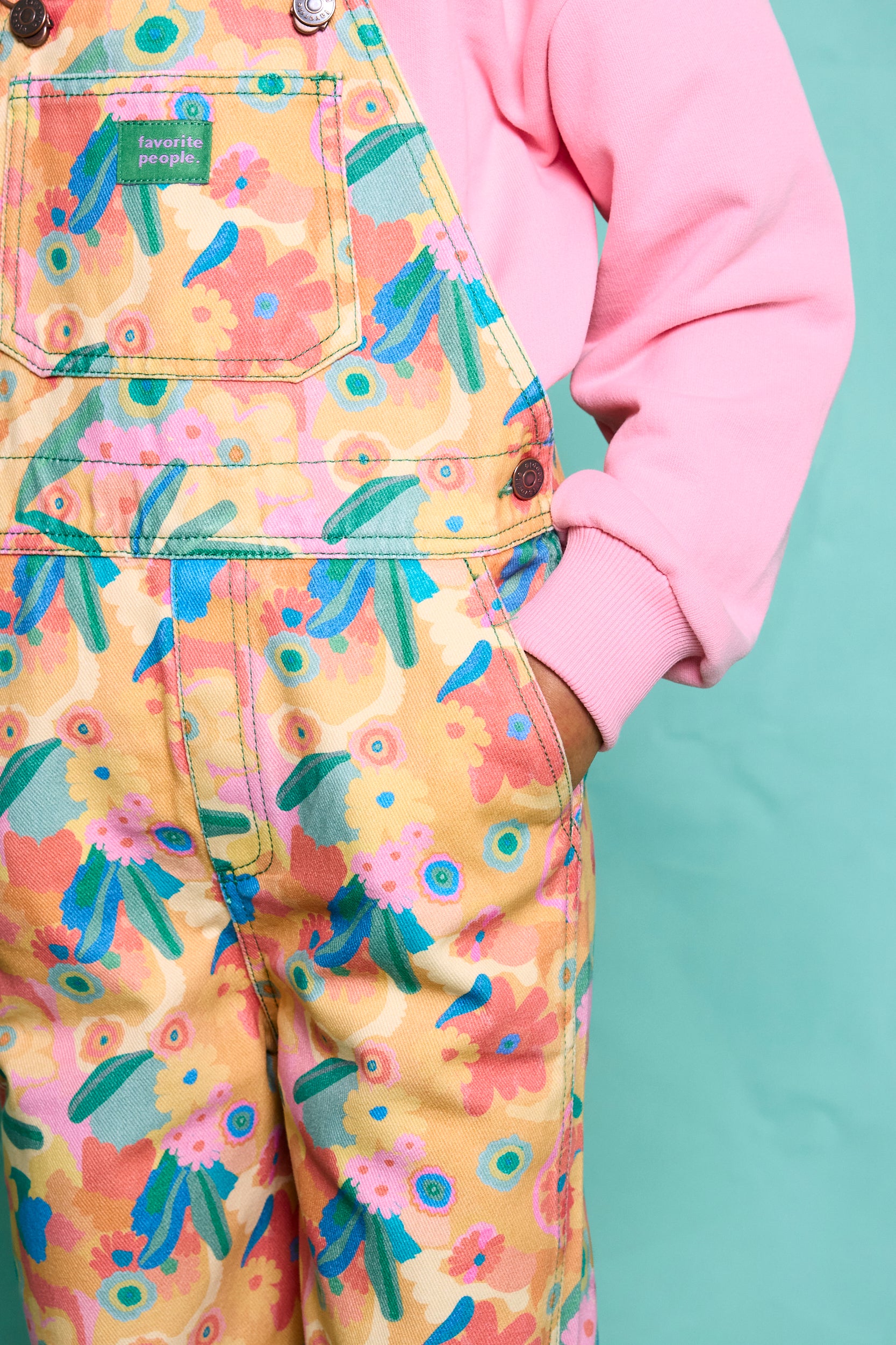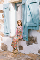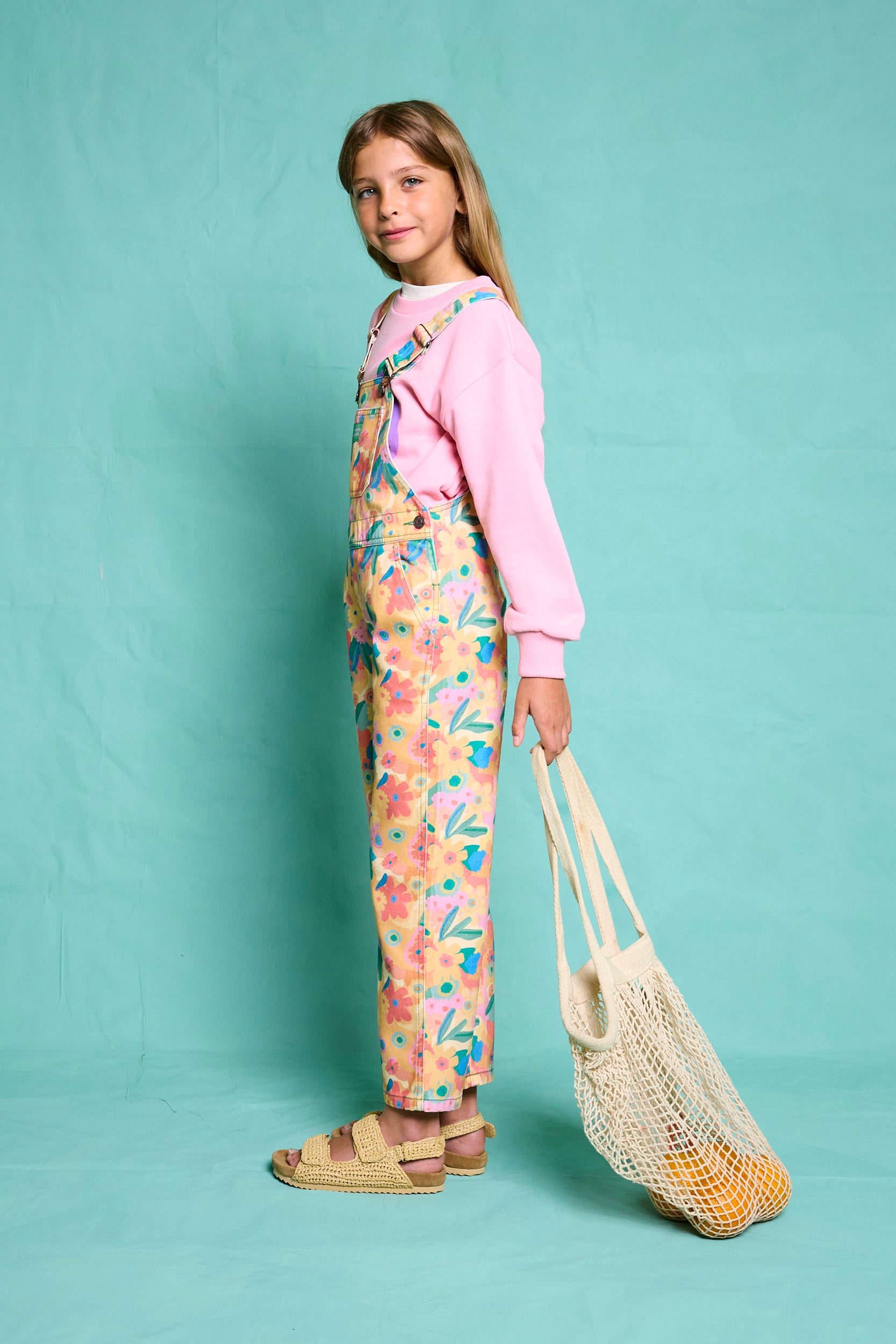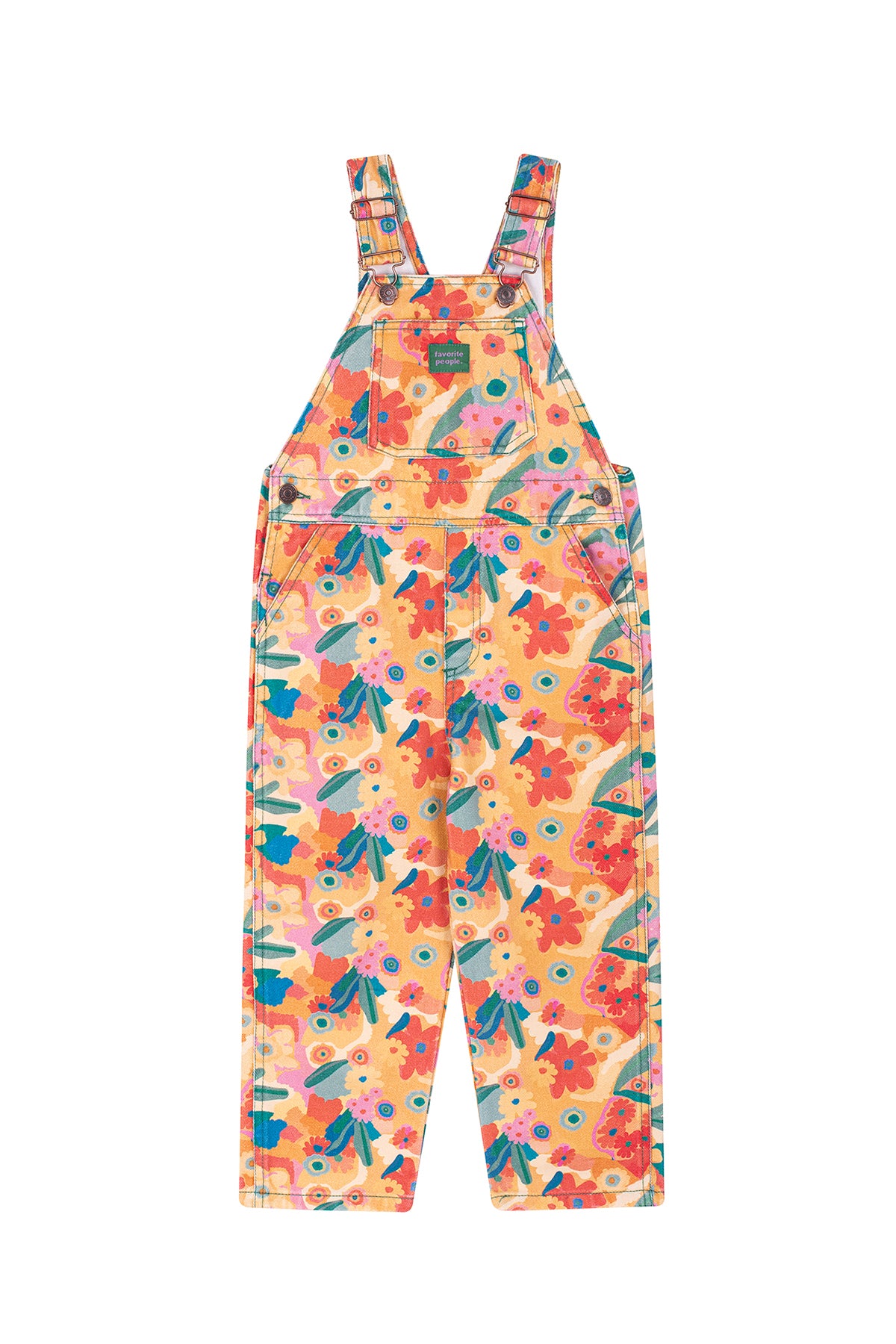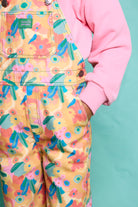 Jardineiras compridas com padrão floral e multicolorido. Alças ajustáveis com botões e bolso à frente e atrás. Resistentes, confortáveis e prontas para dias inteiros de brincadeira.