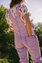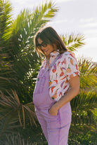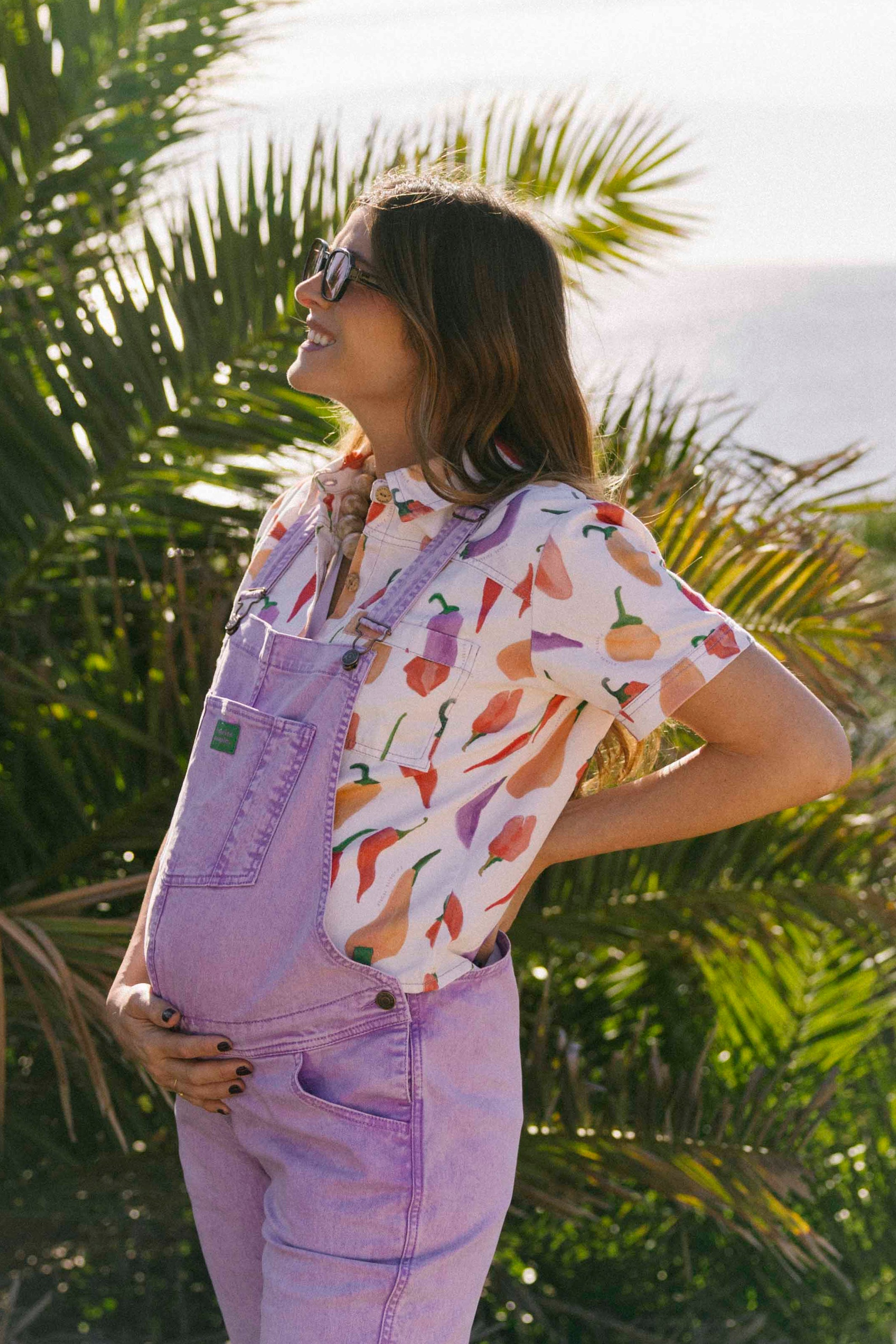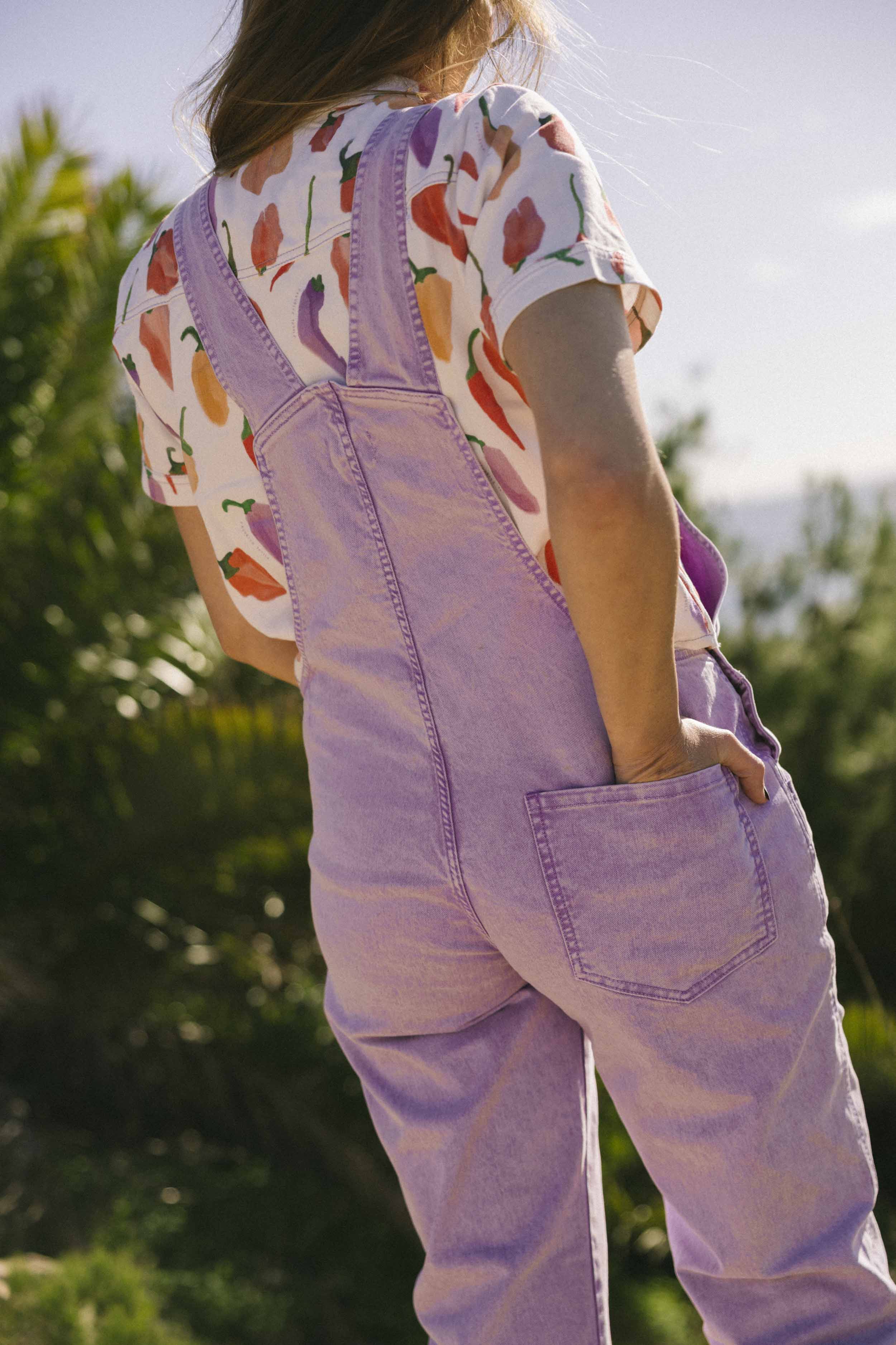 Jardineiras de grávida em lilás para quem não passa despercebida. Apresentam um corte largo que se adapta ao crescimento da barriga, garantindo flexibilidade e um ajuste perfeito em todas as fases. Alças ajustáveis, bolso à frente e atrás e abertura lateral com botões. Confortáveis, resistentes e com aquela atitude que transforma básicos em ícones.
