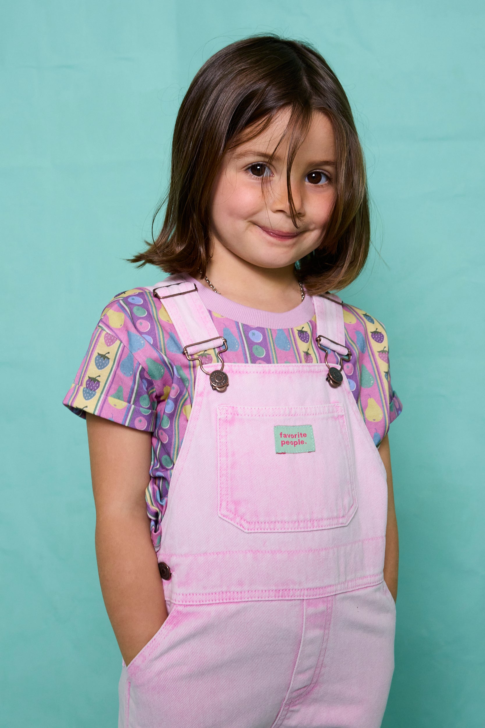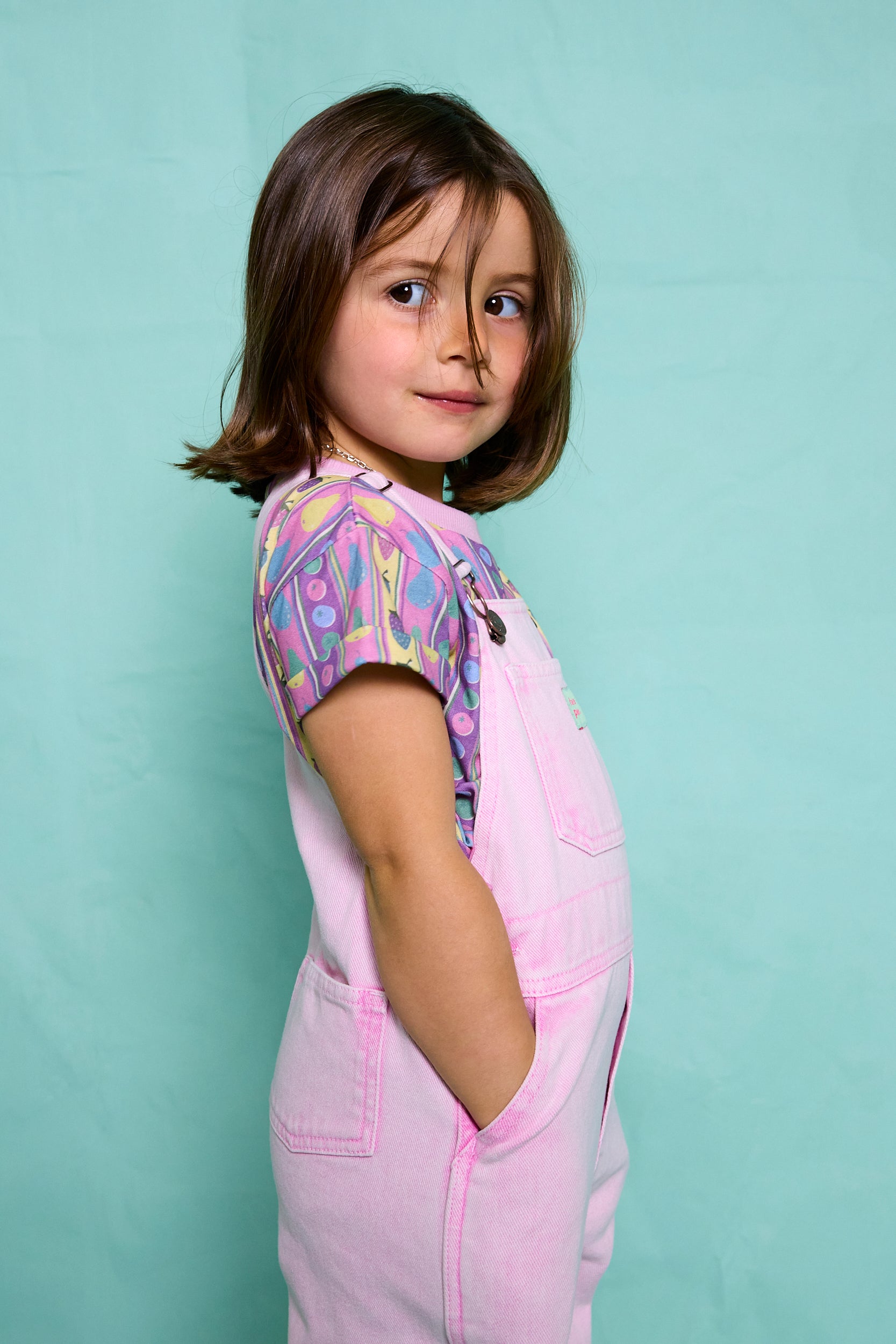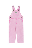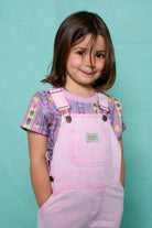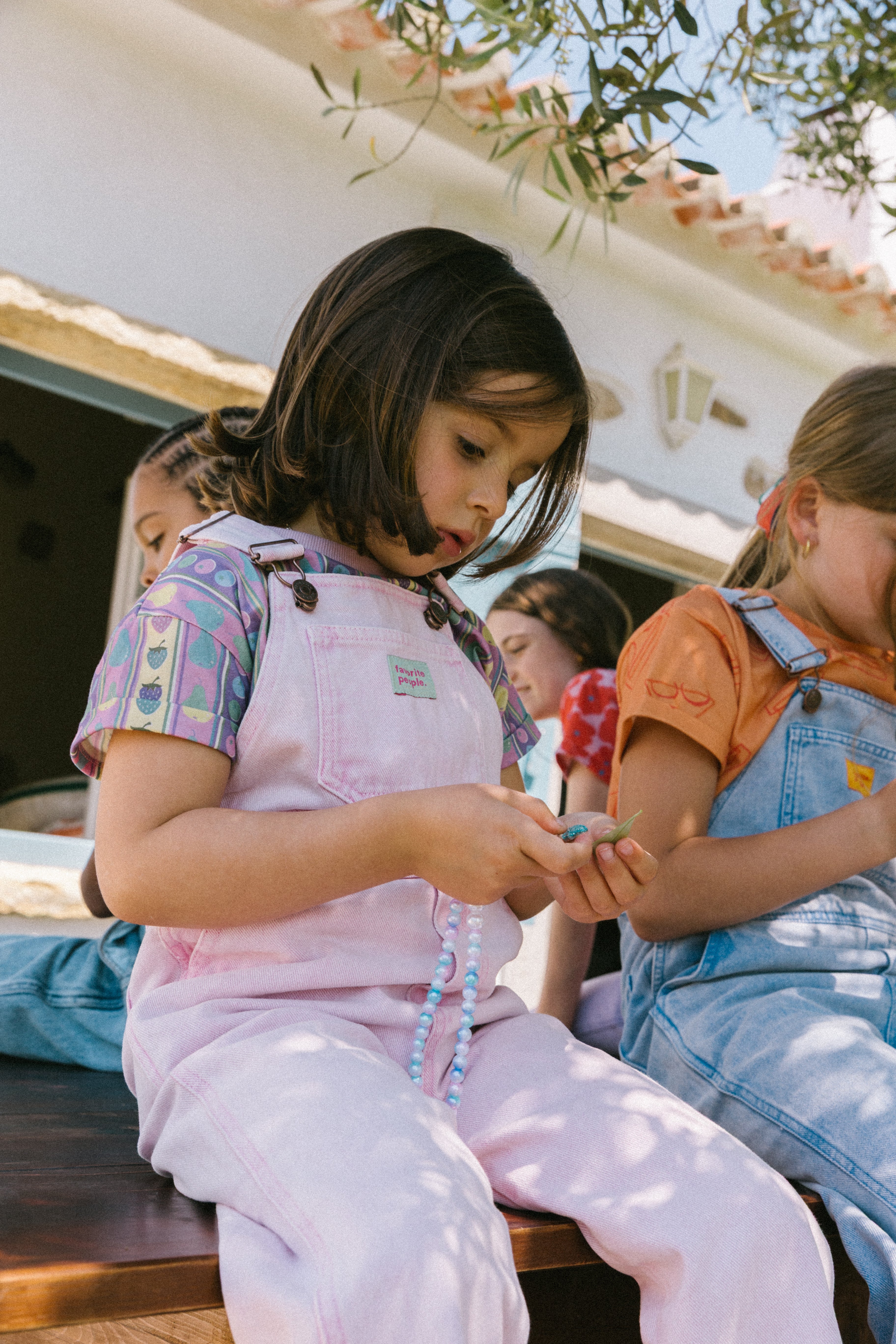Jardineiras compridas para criança em cor de rosa. Alças ajustáveis com botões e bolso à frente e atrás. Resistentes, confortáveis e prontas para dias inteiros de brincadeira.